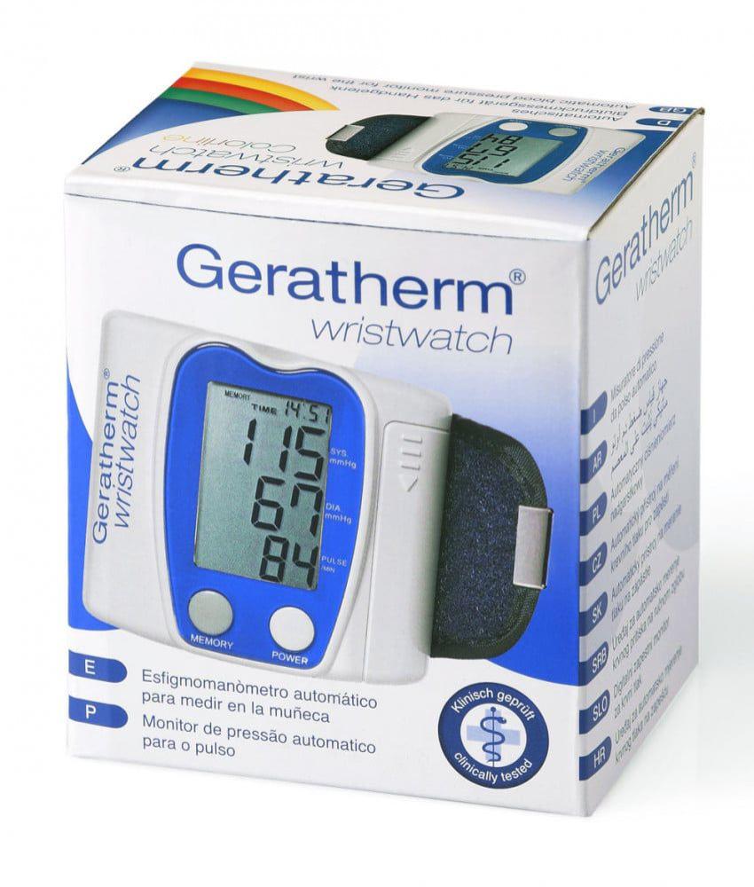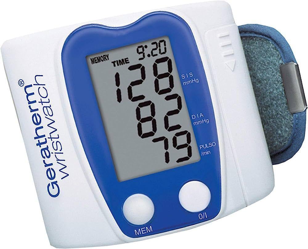 An easy-to-use device that sells millions of devices annually. Lightweight, easy to use, and works directly with one click. It works automatically and completely with fuzzy logic. The device can display the date and time. Memory capacity is 42 readings. It requires two AAA batteries. Geratherm wrist blood pressure monitor.